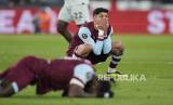 Reaksi West Ham Edson Alvarez saat pertandingan sepak bola leg kedua perempat final Liga Europa antara West Ham dan Bayer 04 Leverkusen di London, Jumat (19/4/2024) dini hari WIB. (FOTO : AP Photo/Kin Cheung)