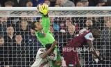 Penjaga gawang West Ham Lukasz Fabianski melakukan penyelamatan saat pertandingan sepak bola leg kedua perempat final Liga Europa antara West Ham dan Bayer 04 Leverkusen di London, Jumat (19/4/2024) dini hari WIB. (FOTO : AP Photo/Kin Cheung)