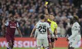 Exequiel Palacios dari Leverkusen, tengah, mendapat kartu kuning saat pertandingan sepak bola leg kedua perempat final Liga Europa antara West Ham dan Bayer 04 Leverkusen di London, Jumat (19/4/2024) dini hari WIB. (FOTO : AP Photo/Kin Cheung)