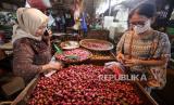 Pedagang melayani pembeli bawang merah di Pasar Senen, Jakarta, Jumat (19/4/2024). Pasca Lebaran, harga bawang merah di Pasar Senen menyentuh harga Rp 70.000 hingga Rp 75.000 per kilogram. Harga tersebut melonjak naik dari saat sebelum Lebaran yang berkisar Rp 35.000 hingga Rp 45.000 per kilogram. (FOTO : Republika/Putra M. Akbar)