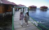 Dua pengunjung melintasi dermaga vila terapung di objek wisata Pulau Nusa Ra di Pulau Bacan, Kabupaten Halmahera Selatan, Maluku Utara, Sabtu (20/4/2024). Pulau Nusa Ra yang berperan penting dalam sektor pariwisata di Pulau Bacan itu telah dikembangkan Pemkab Halmahera Selatan pada tahun 2023 menggunakan dana APBD sebesar Rp6 miliar, dengan membangun 7 unit vila terapung serta fasilitas penunjang lainnya guna meningkatkan kunjungan wisatawan domestik maupun mancanegara sehingga mendorong perekonomian masyarakat di Pulau tersebut. (FOTO : ANTARA FOTO/Andri Saputra)