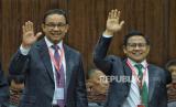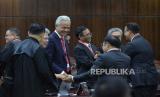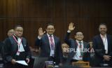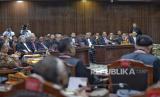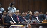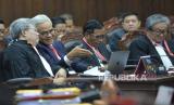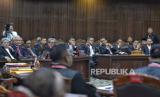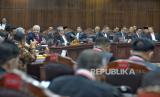 Suasana jalannya sidang putusan Perselisihan Hasil Pemilihan Umum (PHPU) pilpres 2024 di Gedung Mahkamah Konstitusi, Jakarta, Senin (22/4/2024). Dalam sidang tersebut para pemohon hadir langsung yaitu Pasangan capres-cawapres nomor urut 01 Anies Baswedan dan Muhaimin Iskandar dan Pasangan capres-cawapres nomor urut 03 Ganjar Pranowo dan Mahfud MD. (FOTO : Republika/Prayogi )