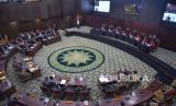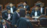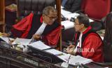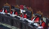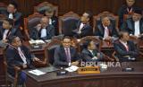 Suasana Hakim Mahkamah Konstitusi (MK) saat memimpin rapat sidang putusan gugatan perselisihan hasil Pemilu Presiden (Pilpres) 2024 di Jakarta, Senin (22/4/2024) (FOTO : Republika/Prayogi)