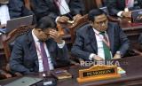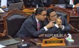 Pasangan capres-cawapres nomor urut 01 Anies Baswedan dan Muhaimin Iskandar didampingi tim hukumnya mengikuti sidang putusan Perselisihan Hasil Pemilihan Umum (PHPU) pilpres 2024 di Gedung Mahkamah Konstitusi, Jakarta, Senin (22/4/2024). Mahkamah Konstitusi (MK) menolak gugatan perselisihan hasil Pemilu Presiden (Pilpres) 2024 yang dimohonkan oleh calon presiden dan calon wakil presiden (capres-cawapres) nomor urut 1 Anies Baswedan-Muhaimin Iskandar. (FOTO : Republika/Prayogi)