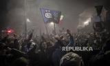 Suporter Inter Milan merayakannya di alun-alun Piazza Duomo usai tim tersebut memenangi laga sepak bola Serie A melawan AC Milan di Milan, Selasa (23/4/2024) dini hari WIB. (FOTO : AP)