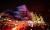 Suporter Inter Milan merayakan perebutan gelar juara Scudetto ke-20 setelah memenangi pertandingan sepak bola Serie A antara AC Miland dan FC inter, di Piazza del Duomo di pusat Milan, Italia, Selasa (23/4/2024) dini hari WIB. (FOTO : ANSA)