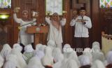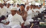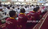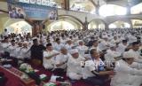 Calon jemaah haji berdoa bersama saat Bimbingan Manasik Haji Tingkat Kota Bandung, di Masjid Pusdai Kota Bandung, Jawa Barat, Selasa (23/4/2024). Kegiatan tersebut bertujuan membantu calon jemaah haji agar memahami tata cara pelaksanaan ibadah haji, termasuk bagaimana berdaptasi dengan situasi dan kondisi di lokasi sehingga mereka dapat mengikuti dan melaksanakan ibadah dengan baik. Acara bimbingan berlangsung pada tanggal 23 dan 25 April 2024. (FOTO : Edi Yusuf/Republika)