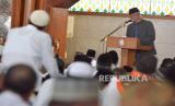 Pj Wali Kota Bandung Bambang Tirtoyuliono menyampaikan sambutan saat acara Bimbingan Manasik Haji Tingkat Kota Bandung yang diikuti oleh ribuan calon jemaah haji, di Masjid Pusdai Kota Bandung, Jawa Barat, Selasa (23/4/2024). Kegiatan tersebut bertujuan membantu calon jemaah haji agar memahami tata cara pelaksanaan ibadah haji, termasuk bagaimana berdaptasi dengan situasi dan kondisi di lokasi sehingga mereka dapat mengikuti dan melaksanakan ibadah dengan baik. Acara bimbingan berlangsung pada tanggal 23 dan 25 April 2024. (FOTO : Edi Yusuf/Republika)