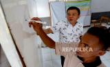 Seorang warga binaan pemasyarakatan (WBP) menjadi tenaga pengajar baca tulis di Lembaga Pemasyarakatan (Lapas) Kelas IIA, Kota Gorontalo, Gorontalo, Selasa (23/4/2024). Lapas Kelas IIA Gorontalo menjalankan program pemberantasan buta aksara yaitu membaca dan menulis bagi warga binan yang dilakukan empat kali dalam satu pekan yang diikuti oleh 30 orang dan dibagi dalam dua kelas belajar. (FOTO : ANTARA FOTO/Adiwinata Solihin)