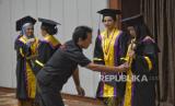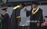 Rektor Universitas Prof. Dr. Moestopo (Beragama) Budiharjo memindahkan tali di topi toga wisudawan dalam acara Dies Natalis ke-63 dan Wisuda Sarjana dan Pascasarjana Universitas Prof. Dr. Moestopo (Beragama) Tahun 2024 di Jakarta Convention Center, Senayan, Jakarta, Selasa (23/4/2024). Universitas Moestopo mewisudakan sebanyak 1.077 mahasiswa dari Fakultas Kedokteran Gigi, Fakultas Ilmu Komunikasi, Fakultas Ilmu Sosial dan Ilmu Politik, Fakultas Ekonomi dan Bisnis, dan Program Pascasarjana. Fakultas-fakultas tersebut sebagian besar sudah mendapatkan akreditasi A Unggul. (FOTO : Republika/Prayogi)