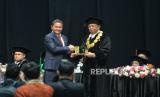 Rektor Universitas Prof. Dr. Moestopo (Beragama) Budiharjo menyerahkan cinderamata kepada Ketua Dewan Kehormatan Penyelenggara Pemilu (DKPP) Heddy Lugito dalam acara Dies Natalis ke-63 dan Wisuda Sarjana dan Pascasarjana Universitas Prof. Dr. Moestopo (Beragama) Tahun 2024 di Jakarta Convention Center, Senayan, Jakarta, Selasa (23/4/2024). Universitas Moestopo mewisudakan sebanyak 1.077 mahasiswa dari Fakultas Kedokteran Gigi, Fakultas Ilmu Komunikasi, Fakultas Ilmu Sosial dan Ilmu Politik, Fakultas Ekonomi dan Bisnis, dan Program Pascasarjana. Fakultas-fakultas tersebut sebagian besar sudah mendapatkan akreditasi A Unggul. (FOTO : Republika/Prayogi)