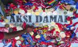 Salah seorang atlet penyandang disabilitas yang tergabung dalam National Paralympic Committee Indonesia (NPCI) Kabupaten Batanghari meletakkan medali miliknya saat melakukan aksi damai di Kantor Bupati Batanghari, Muara Bulian, Batanghari, Jambi, Rabu (24/4/2024). Puluhan atlet asal daerah itu yang sebelumnya berhasil menjadi juara umum pada Pekan Paralympik Provinsi (PEPARPROV) Jambi tahun 2021 dan 2023 melakukan aksi damai menuntut janji pemberian bonus kepada mereka yang hingga kini belum dibayarkan. (FOTO : ANTARA FOTO/Wahdi Septiawan)