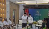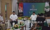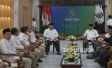 Presiden terpilih periode 2024-2029 sekaligus Ketua Umum Partai Gerindra Prabowo Subianto dan Ketua Umum PKB Muhaimin Iskandar didampingi jajaran petinggi kedua partai politik saat melakukan pertemuan di Kantor DPP PKB, Jakarta, Rabu (24/4/2024). Pertemuan tersebut merupakan bentuk silahturahmi Prabowo usai ditetapkannya oleh KPU sebagai presiden terpilih periode 2024-2029. (FOTO : Republika/Prayogi)