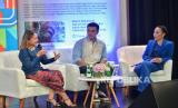 Direktur PT Bank Central Asia Tbk Antonius Widodo Mulyono (tengah) bersama EVP Corporate Communication Social Responsibility BCA Hera F. Haryn (kanan) dan publik figur sekaligus Duta Bakti BCA Nicholas Saputra (kiri) berbincang saat acara peluncuran kampanye #BuktiBaktiBCA di Jakarta, Rabu (24/04/2024). PT Bank Central Asia Tbk menggelar peluncuran kampanye Bukti Bakti BCA yang merupakan program pengembangan berkelanjutan guna memberikan dampak sosial bagi masyarakat dalam sektor pendidikan, kesehatan, lingkungan dan budaya. (FOTO : Republika/Thoudy Badai)