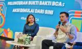 EVP Corporate Communication Social Responsibility BCA Hera F. Haryn (kiri) dan publik figur sekaligus Duta Bakti BCA Nicholas Saputra (kanan) saat memaparkan program Bukti Bakti BCA saat peluncuran kampanye #BuktiBaktiBCA di Jakarta, Rabu (24/04/2024). PT Bank Central Asia Tbk menggelar peluncuran kampanye Bukti Bakti BCA yang merupakan program pengembangan berkelanjutan guna memberikan dampak sosial bagi masyarakat dalam sektor pendidikan, kesehatan, lingkungan dan budaya. (FOTO : Republika/Thoudy Badai)