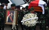 REPUBLIKA.CO.ID, BOGOR -- Sejumlah prajurit TNI mengangkat peti jenazah almarhumah Mooryati Soedibyo di area Taman Pembibitan Obat Tradisional Mustika Ratu, Desa Tapos, Ciawi, Kabupaten Bogor, Jawa Barat, Rabu (24/4/2024).