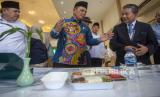 Gubernur Kepri Ansar Ahmad (tengah) melihat contoh paket makanan untuk jamaah calon haji selama dalam penerbangan di Gedung Pusat Informasi Haji (PIH) Batam, Kepulauan Riau, Kamis (25/4/2024). Tes makanan tersebut untuk memastikan standarisasi makanan yang disajikan kepada calon jamaah haji selama dalam penerbangan. (FOTO : ANTARA FOTO/Teguh Prihatna)