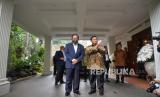 Presiden terpilih sekaligus Ketua Umum Partai Gerindra Prabowo Subianto bersama Ketua Umum Partai Nasdem Surya Paloh bersiap memberikan keterangan usai melakukan pertemuan di Kertanegara, Jakarta, Kamis (25/4/2024). Kedatangan Surya Paloh tersebut untuk bersilahturahmi pasca di tetapkannya Prabowo sebagai Presiden terpilih periode 2024-2029 oleh KPU. Dalam kesempatan itu pula Prabowo dan Surya Paloh sepakat bekerja sama untuk kepentingan rakyat Indonesia. (FOTO : Republika/Prayogi)