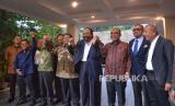 Presiden terpilih sekaligus Ketua Umum Partai Gerindra Prabowo Subianto bersama Ketua Umum Partai Nasdem Surya Paloh didampingi jajaran petinggi kedua partai usai melakukan pertemuan di Kertanegara, Jakarta, Kamis (25/4/2024). Kedatangan Surya Paloh tersebut untuk bersilahturahmi pasca di tetapkannya Prabowo sebagai Presiden terpilih periode 2024-2029 oleh KPU. Dalam kesempatan itu pula Prabowo dan Surya Paloh sepakat bekerja sama untuk kepentingan rakyat Indonesia. (FOTO : Republika/Prayogi)