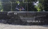 Pengendara motor melintasi jalan yang amblas di Jalan Raya Loji, Wanasari, Telukjambe Barat, Kabupaten Karawang, Jawa Barat, Jumat (26/4/2024). Jalan yang menghubungkan Karawang dan Kabupaten Bekasi tersebut amblas sehingga untuk kendaraan roda empat harus menggunakan sistem buka tutup. (FOTO : ANTARA FOTO/Robby Hamzah)