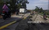 REPUBLIKA.CO.ID, KARAWANG -- Pengendara motor melintas di sebelah jalan yang amblas di Jalan Raya Loji, Wanasari, Telukjambe Barat, Kabupaten Karawang, Jawa Barat, Jumat (26/4/2024).