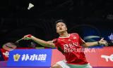 Pebulu tangkis tunggal putra Indonesia Anthony Sinisuka Ginting berusaha mengembalikan kok ke arah lawannya pebulu tangkis tunggal putra Inggris Harry Huang dalam babak kualifikasi grup Piala Thomas 2024 di Chengdu Hi Tech Zone Sports Center Gymnasium, Chengdu, China, Sabtu (27/4/2024). Anthony Ginting menang dengan dua gim langsung 21-8, 21-15. Tim Indonesia unggul atas Inggris dengan skor 5-0. (FOTO : ANTARA FOTO/Galih Pradipta)