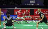 Pebulu tangkis ganda putra Indonesia Bagas Maulana (kedua kiri) dan Shohibul Fikri (kedua kanan) berusaha mengembalikan kok ke arah lawannya pebulu tangkis ganda putra Inggris Callum Hemming dan Ethan Van Leeuwen dalam babak kualifikasi grup piala Thomas 2024 di Chengdu Hi Tech Zone Sports Center Gymnasium, Chengdu, China, Sabtu (27/4/2024). Fikri/Maulana menang dengan tiga gim yakni 16-21, 21-14, 21-13. Tim Indonesia unggul atas Inggris dengan skor 5-0. (FOTO : ANTARA FOTO/Galih Pradipta)