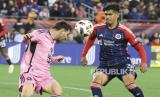 Penyerang Inter Miami Lionel Messi (Kiri) dan gelandang New England Revolution Mark-Anthony Kaye (kanan) berebut bola pada paruh pertama pertandingan MLS antara New England Revolution dan Inter Miami di Foxborough, Massachusetts, AS, Ahad (28/4/2024) dini hari WIB. (FOTO : EPA)