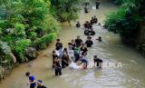 Sejumlah santri Pondok Pesantren Tahfidz Al Musthofa Tebuireng 16 melepaskan bibit ikan Nilem saat Sodaqoh Alam memperingati Hari Bumi 2024 di Sungai Simangut, Wadas, Kandangan, Temanggung, Jawa Tengah, Ahad (28/4/2024). Pada aksi santri peduli lingkungan tersebut dilaksanakan bersih-bersih sungai dan menebar sedikitnya 15.000 ekor bibit ikan Nilem sebagai bentuk kepedulian terhadap alam sekitar sekaligus memberikan manfaat ekonomi bagi masyarakat. (FOTO : ANTARA FOTO/Anis Efizudin)