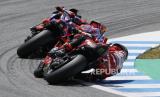 Pembalap MotoGP Italia Francesco Bagnaia (kanan) (Ducati Lenovo Team) dan pembalap Spanyol Jorge Martin (Kiri) (Prima Pramac Racing) saat Grand Prix Sepeda Motor Spanyol di sirkuit Jerez-Angel Nieto di Jerez de la Frontera (Cadiz), Spanyol, Ahad (28/4/2024). (FOTO : EFE)