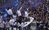 Fans Inter menunggu tim di Piazza Duomo merayakan kemenangan gelar Liga Serie A Italia, di Milan, Italia, Ahad (28/4/2024). (FOTO : ANSA)