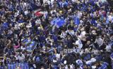 Kerumunan penggemar menunggu bus yang membawa para pemain tim sepak bola Inter Milan merayakan gelar liga top Serie A Italia ke-20, di Milan, Italia, Ahad (28/4/2024). (FOTO : AP)