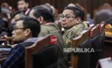 Ketua KPU Hasyim Asyari mengikuti jalannya sidang di Mahkamah Konstitusi, Jakarta, Senin (29/4/2024). Mahkamah Konstitusi mulai menggelar sidang pendahuluan Perselisihan Hasil Pemilihan Umum (PHPU) pemilu legislatif 2024 untuk anggota DPR RI, DPRD Provinsi, DPRD Kabupaten dan Kota. Sebanyak 297 perkara yang dimohonkan oleh partai politik dan perseorangan tersebut dibagi dalam tiga panel yang dipimpin oleh tiga hakim yang memutuskan PHPU untuk Pileg 2024. (FOTO : Republika/Putra M. Akbar)