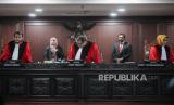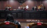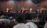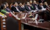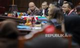 REPUBLIKA.CO.ID, JAKARTA -- Ketua Hakim Mahkamah Konstitusi (MK) Arief Hidayat bersama Hakim MK Anwar Usman dan Enny Nurbaningsih memimpin jalannya sidang di Mahkamah Konstitusi, Jakarta, Senin (29/4/2024).