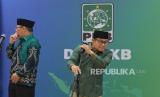 Ketua Umum PKB Muhaimin Iskandar bersama Plt Ketum PPP Muhamad Mardiono bersiap memberikan keterangan usai melakukan pertemuan di Kantor DPP PKB, Jakarta, Senin (29/4/2024). Pertemuan silahturahmi antara PPP dan PKB tersebut membahas agenda politik nasional dan termasuk persiapan pilkada. (FOTO : Republika/Prayogi)