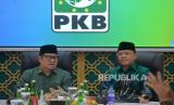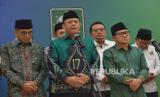 Ketua Umum PKB Muhaimin Iskandar bersama Plt Ketum PPP Muhamad Mardiono dan jajaran petinggi kedua partai memberikan keterangan usai melakukan pertemuan di Kantor DPP PKB, Jakarta, Senin (29/4/2024). Pertemuan silahturahmi antara PPP dan PKB tersebut membahas agenda politik nasional dan termasuk persiapan pilkada. (FOTO : Republika/Prayogi)