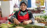 Seorang pedagang sayur mayur nasabah Jak One Merchant Bank DKI tengah menjajakan dagangannya di Pasar Jati Rawasari, Jakarta Pusat (30/4/2024). Sampai dengan Q1 2024, kredit dan pembiayaan UMKM Bank DKI naik 39,18?ri Rp3,8 triliun per Maret 2023 menjadi Rp5,2 triliun Per Maret 2024. (FOTO : Dok.Republika)
