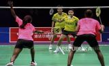 REPUBLIKA.CO.ID, CHENGDU. -- Pebulu tangkis ganda putri Indonesia Siti Fadia Silva Ramadhanti (kiri) dan Apriyani Rahayu (kanan) berusaha mengembalikan kok ke arah lawannya pebulu tangkis ganda putri Uganda Husina Kobugabe dan Galdys Mbabazi dalam babak kualifikasi grup Piala Uber 2024 di Chengdu Hi Tech Zone Sports Center Gymnasium, Chengdu, China, Senin (29/4/2024).