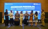 Direktur Pelayanan BPJamsostek Roswita Nilakurnia (keempat kanan) bersama Direktur Pemasaran Perumnas Imelda Alini Pohan (ketiga kanan) dan Ketua Umum Asosiasi Pengusaha Indonesia (APINDO) Shinta Widjaja Kamdani (keempat kiri) berbincang saat kegiatan penandatanganan kerjasama BPJamsostek bersama Perumnas di Jakarta, Selasa (30/4/2024). BPJamsostek bersama Permunas menjalin kerjasama dalam penyaluran manfaat layanan tambahan (MLT) yakni progrom hunian bagi pekerja guna memberikan kemudahan dan kepastian bagi pekerja untuk memiliki hunian sekaligus mensukseskan program Sejuta Rumah. (FOTO : Republika/Thoudy Badai)