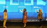 Direktur Pelayanan BPJamsostek Roswita Nilakurnia (kanan) bersama Direktur Pemasaran Perumnas Imelda Alini Pohan (tengah) dan Ketua Umum Asosiasi Pengusaha Indonesia (APINDO) Shinta Widjaja Kamdani (kiri) saat meluncurkan program hunian pekerja dalam kegiatan penandatanganan kerjasama BPJamsostek bersama Perumnas di Jakarta, Selasa (30/4/2024). BPJamsostek bersama Permunas menjalin kerjasama dalam penyaluran manfaat layanan tambahan (MLT) yakni progrom hunian bagi pekerja guna memberikan kemudahan dan kepastian bagi pekerja untuk memiliki hunian sekaligus mensukseskan program Sejuta Rumah. (FOTO : Republika/Thoudy Badai)