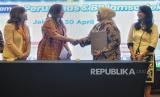 Direktur Pelayanan BPJamsostek Roswita Nilakurnia (kedua kanan) bersama Direktur Pemasaran Perumnas Imelda Alini Pohan (kedua kiri) bersalaman disaksikan Ketua Umum Asosiasi Pengusaha Indonesia (APINDO) Shinta Widjaja Kamdani (kiri) usai menandatangani kerjasama BPJamsostek bersama Perumnas di Jakarta, Selasa (30/4/2024). BPJamsostek bersama Permunas menjalin kerjasama dalam penyaluran manfaat layanan tambahan (MLT) yakni progrom hunian bagi pekerja guna memberikan kemudahan dan kepastian bagi pekerja untuk memiliki hunian sekaligus mensukseskan program Sejuta Rumah. (FOTO : Republika/Thoudy Badai)