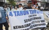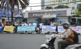 Puluhan mantan karyawan PT Pikiran Rakyat Bandung menggelar unjuk rasa, di Teras Kantor Pikiran raktyat, Jalan Asia Afrika, Kota Bandung, Kamis (18/4/2024). Aksi eks media legendaris di Jabar ini menuntut hak-hak yang belum juga dibayarkan dalam waktu 4 tahun lebih. (FOTO : Edi Yusuf/Republika)