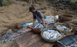 Seorang buruh pelabuhan membuang ikan hasil tangkapan nelayan ke dalam lubang untuk dikubur di kawasan Pelabuhan Perikanan Samudera (PPS) , Lampulo, Banda Aceh, Aceh, Kamis (2/5/2024). Menurut nelayan setempat, sekitar tiga ton ikan dencis dan ikan tongkol kecil terpaksa dibuang dengan cara dikubur karena hasil tangkapan ikan melimpah dan harga jual anjlok kisaran Rp1.000 hingga Rp3.000 per kilogram, sedangkan dalam kondisi normal harga ikan tersebut kisaran Rp10.000 hingga Rp15.000 per kilogram. (FOTO : ANTARA FOTO/Ampelsa)