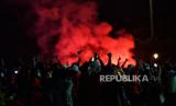 Para penonton mayoritas mengenakan kostum berwarna merah dan putih. Mereka terlihat bersemangat sambil membawa bendera merah putih.