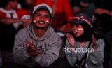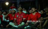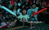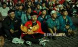 Pendukung Timnas Indonesia menyaksikan pertandingan Piala Asia U-23 antara Indonesia melawan Iraq pada babak perebutan juara tiga di kawasan Monumen Nasional (Monas) Jakarta, Kamis (3/5/2024). Timnas Indonesia berhasil unggul melalui tendangan Ivar Jenner di menit ke-19, namun keunggulan Garuda Muda tidak bertahan lama setelah sundulan Zaid Tahseen berhasil merobek gawang Ernando pada menit ke-27. (FOTO : Republika/Thoudy Badai)