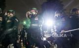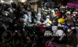 Petugas polisi menghadapi demonstran yang berkumpul di perkemahan pengunjuk rasa pro-Palestina di kampus Universitas California Los Angeles (UCLA) di Los Angeles, California, AS, (2/5/2024). (FOTO : EPA)