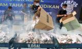 REPUBLIKA.CO.ID, LHOKSEUMAWE -- Petugas Bea dan Cukai melakukan pemusnhan rokok ilegal di Kantor Pengawasan dan Pelayanan Bea dan Cukai, Lhokseumawe, Aceh, Jumat (03/05/2024). Sebanyak 298.000 batang rokok non cukai atau ilegal berbagai merek dan jenis hasil tangkapan tersebut dimusnahkan dengan cara dibakar.