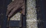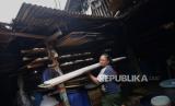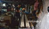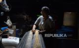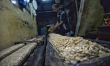 Perajin memproduksi tempe dengan bahan baku kedelai impor di Kawasan Kemayoran, Jakarta, Jumat (3/5/2024). Menurut perajin tren pelemahan nilai tukar rupiah terhadap dolar AS yang masih terus berlanjut ini, mulai berdampak pada kenaikan harga kedelai yang menjadi bahan baku utama membuat tempe. Harga jual tempe pun masih belum mengalami kenaikan. Saat ini harga tempe masih berkisar antara Rp. 5000 hingga Rp.10.000 tergantung ukurannya (FOTO : Republika/Prayogi)