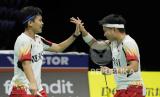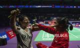 Pebulu tangkis ganda putri Indonesia Siti Fadia Silva Ramadhanti dan Apriyani Rahayu melakukan selebrasi seusai melawan pebulu tangkis ganda putri Thailand Jongkolphan dan Rawinda Prajongjai dalam babak perempatfinal Piala Uber 2024 di Chengdu Hi Tech Zone Sports Center Gymnasium, Chengdu, China, Jumat (3/5/2024). Pasangan Apriyani/Fadia menang dalam dua gim 21-17, 21-14 dan tim Indonesia unggul atas Thailand dengan skor 3-0. (FOTO : AP Photo/Ng Han Guan)