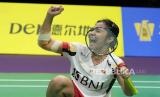 Pebulu tangkis tunggal putri Indonesia Ester Nurumi Tri Wardoyo melakukan selebrasi usai menang saat melawan pebulu tangkis tunggal putri Thailand Supanida Katethong dalam babak perempatfinal Piala Uber 2024 di Chengdu Hi Tech Zone Sports Center Gymnasium, Chengdu, China, Jumat (3/5/2024). Ester Nurumi Tri Wardoyo menang dengan tiga gim 19-21, 21-19, 21-19 dan tim Indonesia menang atas Thailand dengan skor 3-0. (FOTO : AP Photo/Ng Han Guan)